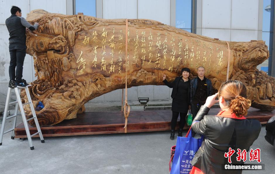4月10日,在长春一展会上,一根长7.5米、重5吨的樟木根雕亮相,吸引许多市民围观。据了解,这棵根雕是通过4人历时一年半雕刻而成的,根雕上面刻有毛泽东诗词《沁园春·雪》以及长城、松柏等图案。展商对这棵根雕的标价是580万元人民币。中新社发 张瑶 摄