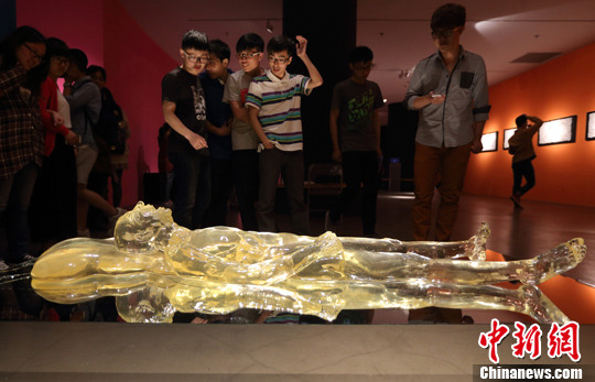 4月10日,观众被展出的以陶和瓷为材质的艺术作品吸引。当日,《CHINA:当代陶瓷炼金术》当代陶瓷艺术展在南京举行。中新社发 泱波 摄