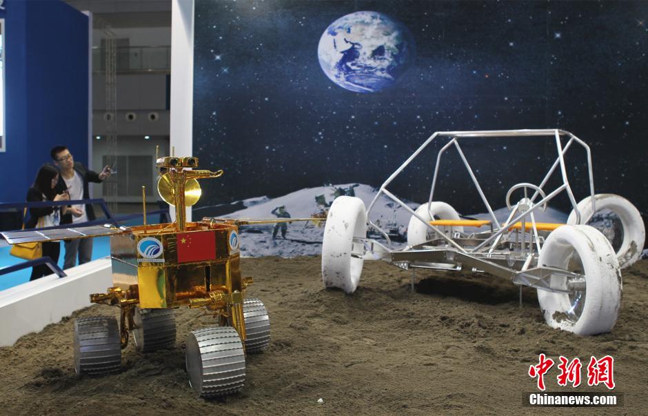 4月11日,第十一届重庆高交会暨第七届国际军博会在重庆南坪国际会展中心举行。此次展会以“军民融合、创新发展”为主题,现场有来自美国、俄罗斯、意大利等国,以及北京、上海、天津、四川等省区市约57个展团、770家企业、24所高校及科研院所参展,参展项目1613个。图为重庆造载人月球车首次公开亮相与市民见面。 周毅 摄
