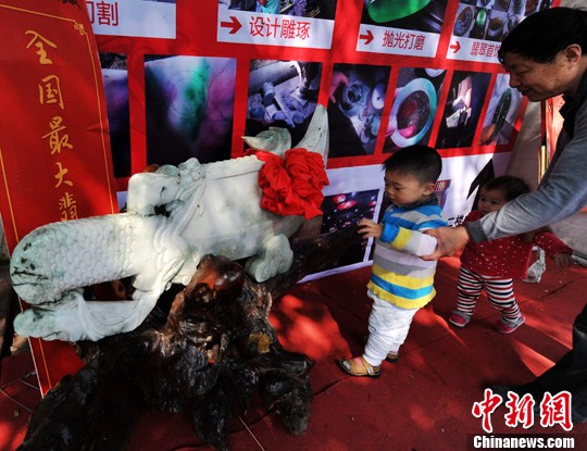 4月12日,一把长125cm、宽65cm、重160公斤由翡翠雕刻制作而成,有着“中国最大翡翠如意宝刀”之称的翡翠工艺品亮相福州,吸引了许多市民前来观赏。中新社发 张斌 摄