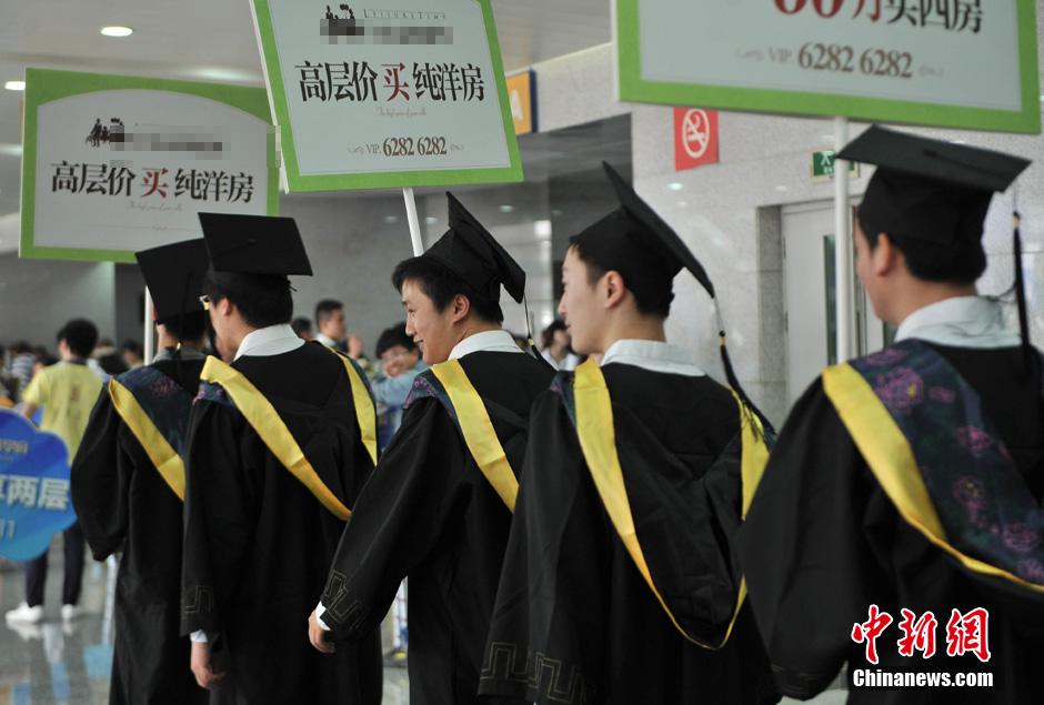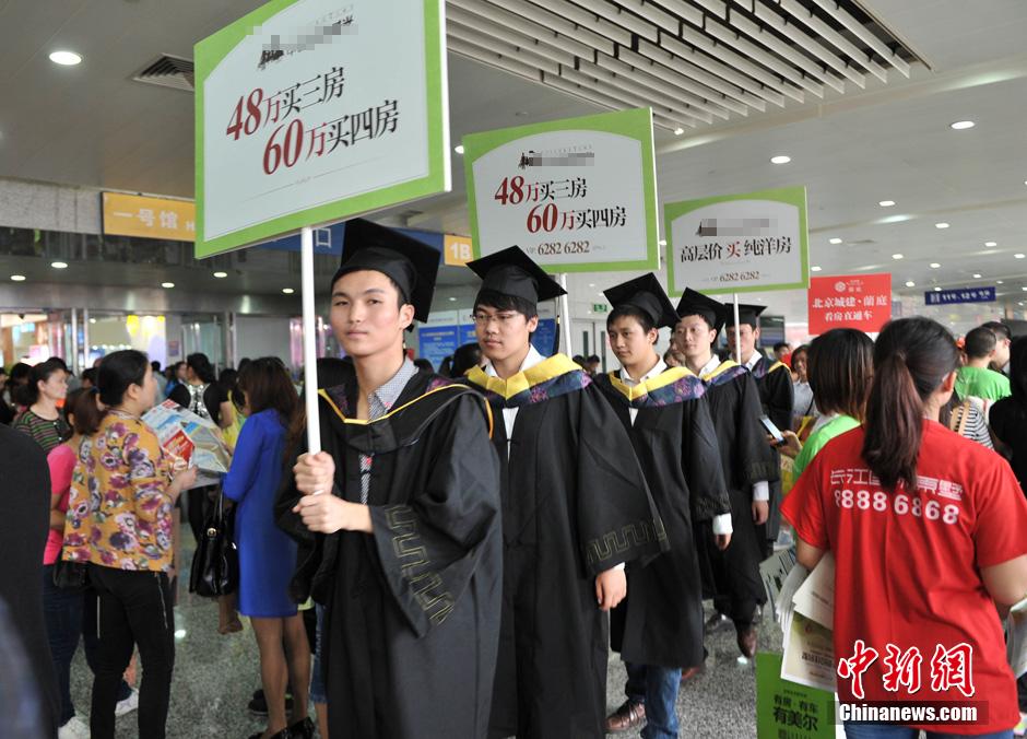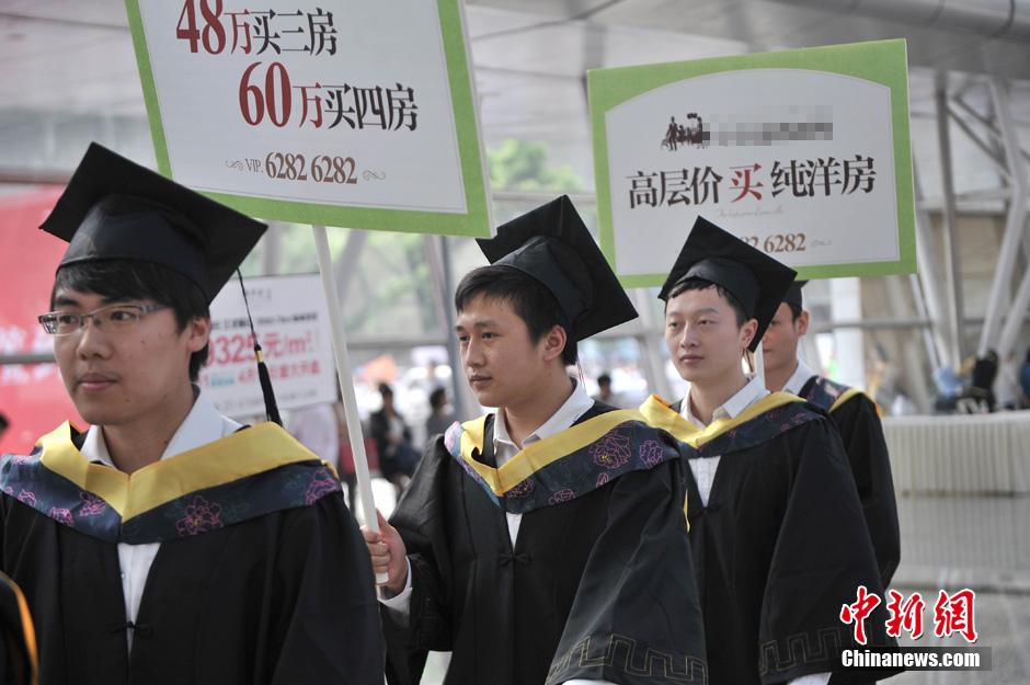 4月17日,2014年重庆春季房产交易会在南坪国际会展中心举行。图为重庆房交会上某楼盘工作人员穿学士装宣传自己的楼盘。陈超 摄