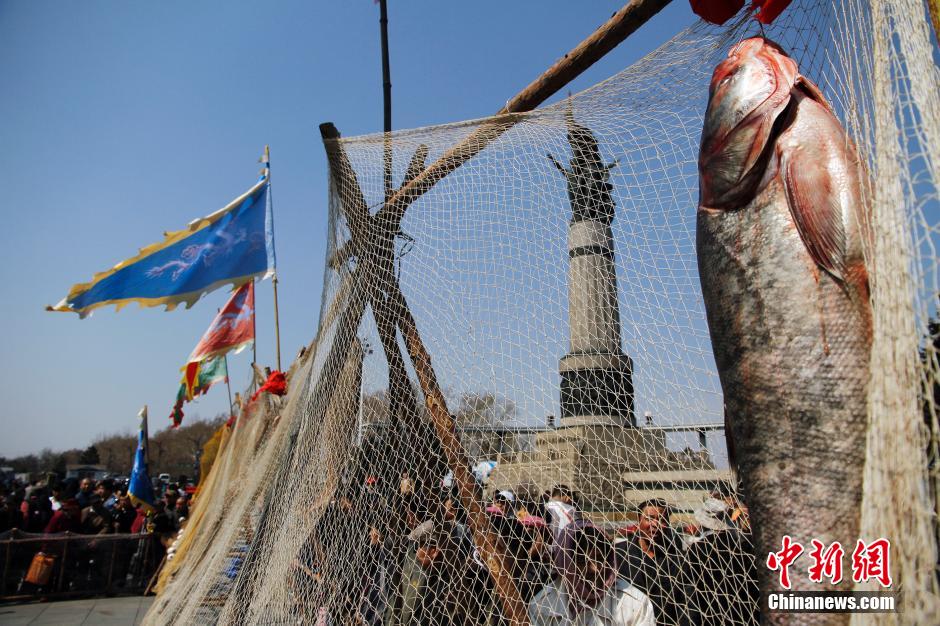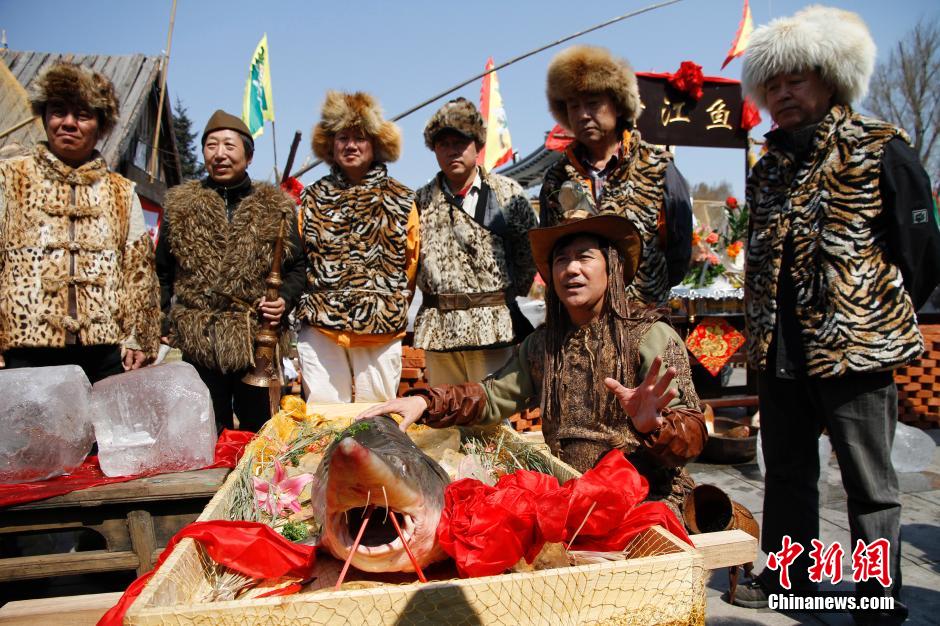 4月18日,哈尔滨松花江畔,第三届哈尔滨市松花江开江节在此拉开帷幕。松花江古老的开江文化,最早可追溯到一千年前契丹人建辽,每到开江时节,古人在泛江捕鱼之时,都要进行神秘的祭江大典,以此祭奠江中的神灵。中新社发 胡迪 摄