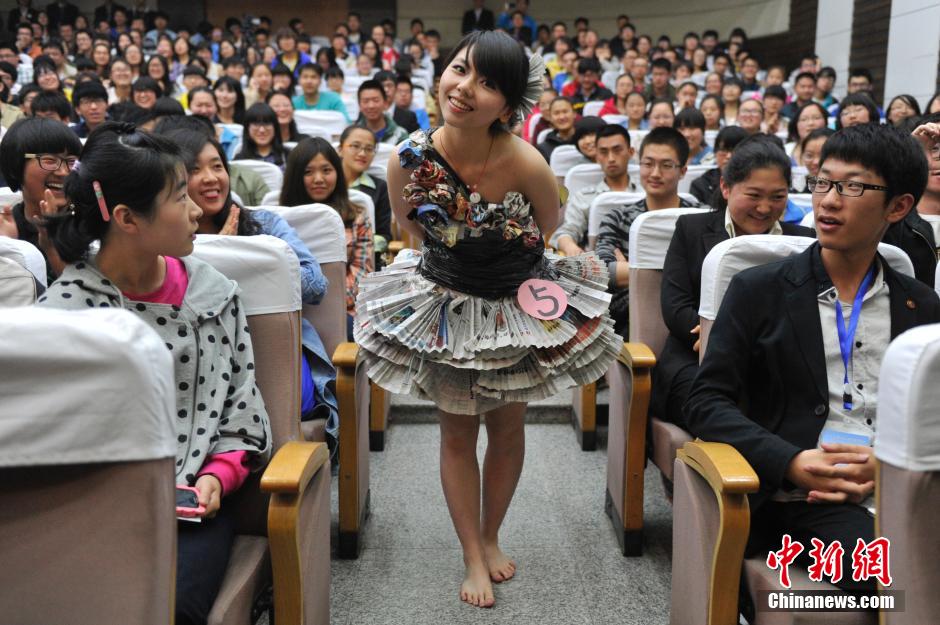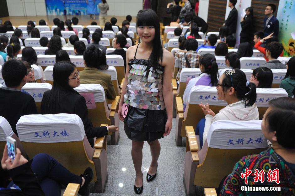 图为一名学生模特展示废旧光盘制作的衣服。中新社发 韦亮 摄