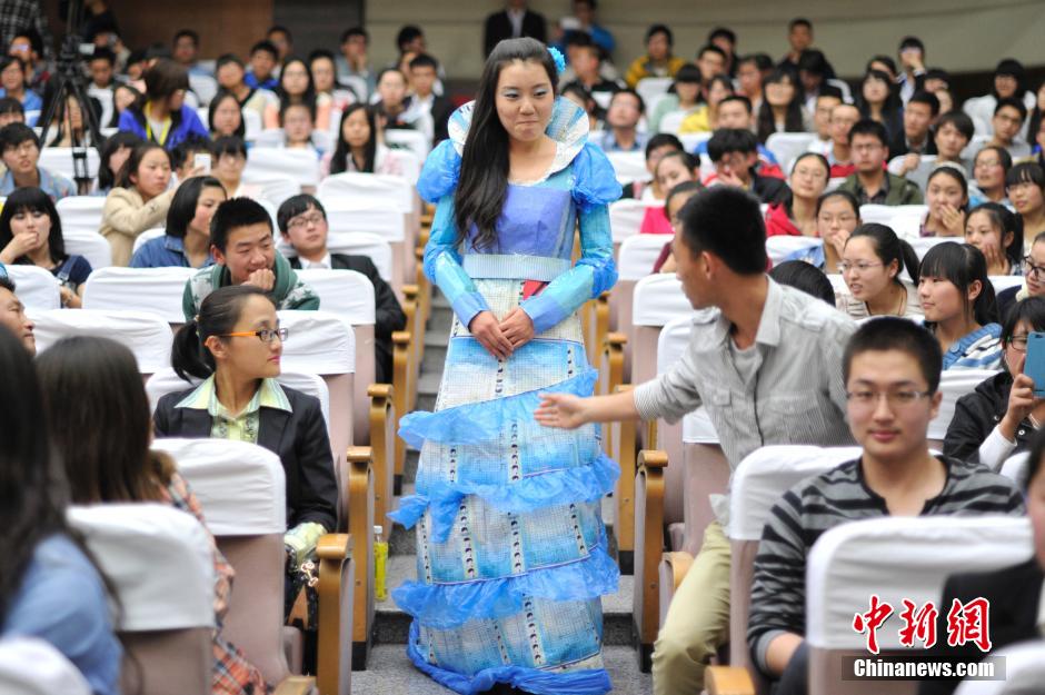 图为大学生模特展示用废纸制作的“蓝色妖姬”时装。中新社发 韦亮 摄