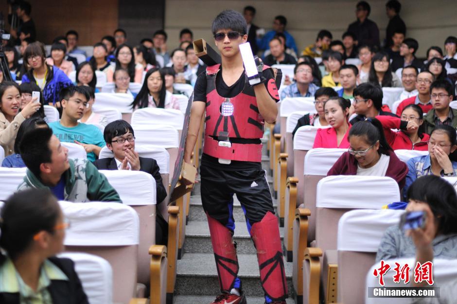 图为大学生模特展示废旧纸箱子做的“钢铁盔甲”。中新社发 韦亮 摄