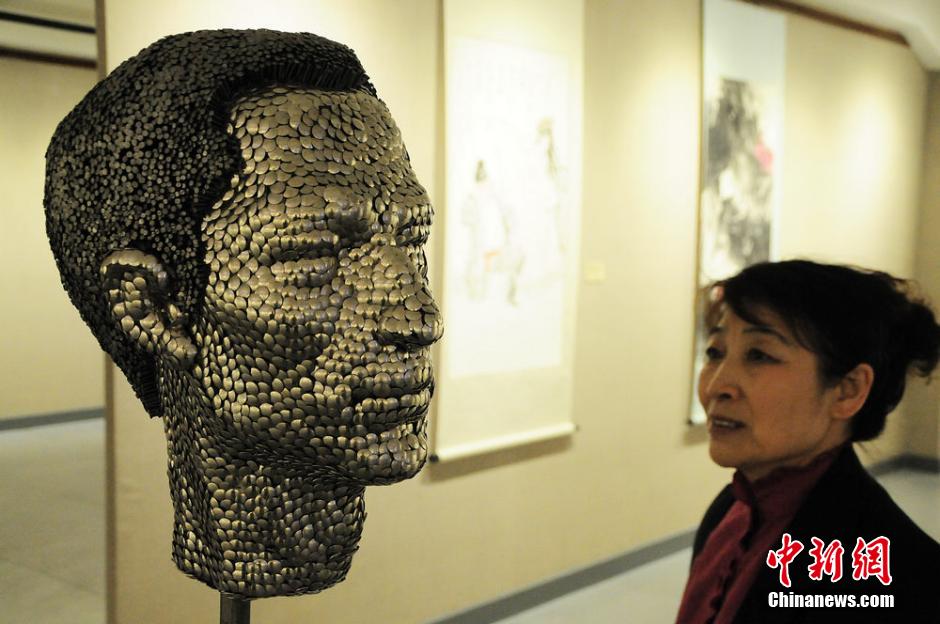 4月22日拍摄于新疆乌鲁木齐市美术馆,这里正在举办美术作品展,其中一件用普通钉子拼成的人像作品引人注目,作品名称为《头像——铁钉实验》。马新龙 摄