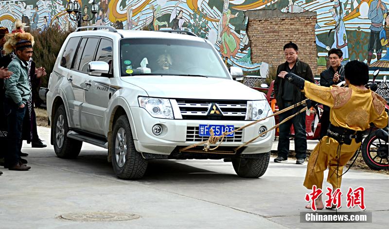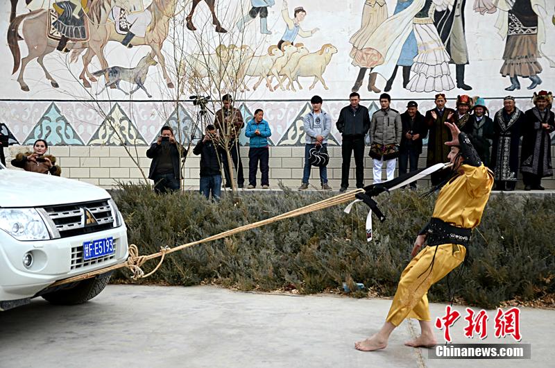 每年的3月22日至4月22日,是哈萨克族传统节之一的那吾热孜节。今年那吾热孜节期间,哈萨克斯坦大力士贾玛林·迪罕在甘肃阿克塞民族风情园内给前来参加那吾热孜节文体活动的群众现场展示了嘴拉车、咽喉推车、赤脚上锐切刀梯、嘴吊重石头、举重等精彩表演。马汉·哈帕斯 摄