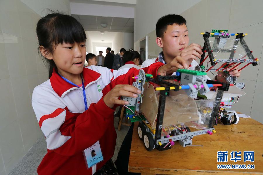 4月22日,两名学生在整理自己制作的“搬运机器人”。当日,一场妙趣横生的机器人比赛在山东省潍坊市寒亭外国语学校举行,来自潍坊全市70多所中小学校的80多支队伍参加。比赛分为机器人基本技能比赛、机器人创意比赛、机器人篮球比赛等竞赛项目。新华社发(张驰 摄)