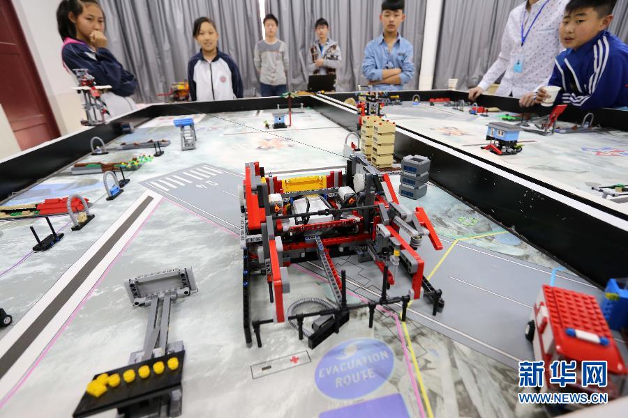 4月22日,学生们制作的机器人在参加比赛。当日,一场妙趣横生的机器人比赛在山东省潍坊市寒亭外国语学校举行,来自潍坊全市70多所中小学校的80多支队伍参加。比赛分为机器人基本技能比赛、机器人创意比赛、机器人篮球比赛等竞赛项目。新华社发(张驰 摄)