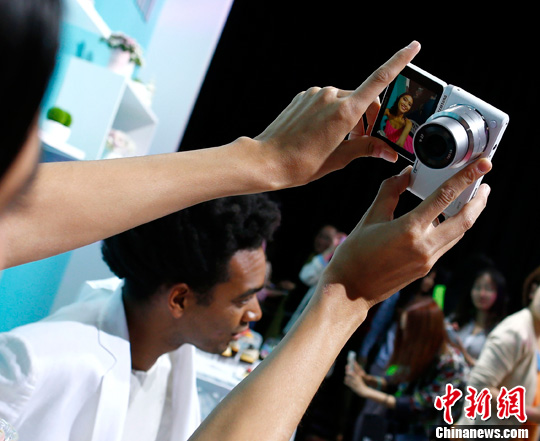 4月22日,消费者在体验NX mini的自拍功能。中新社发 富田 摄