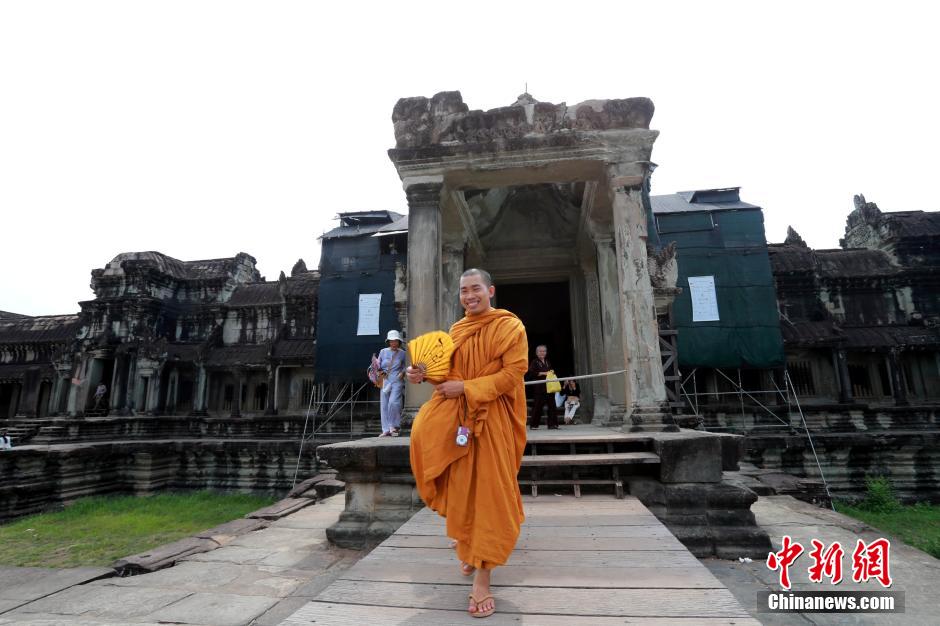 图为柬埔寨暹粒市吴哥窟内的僧人。