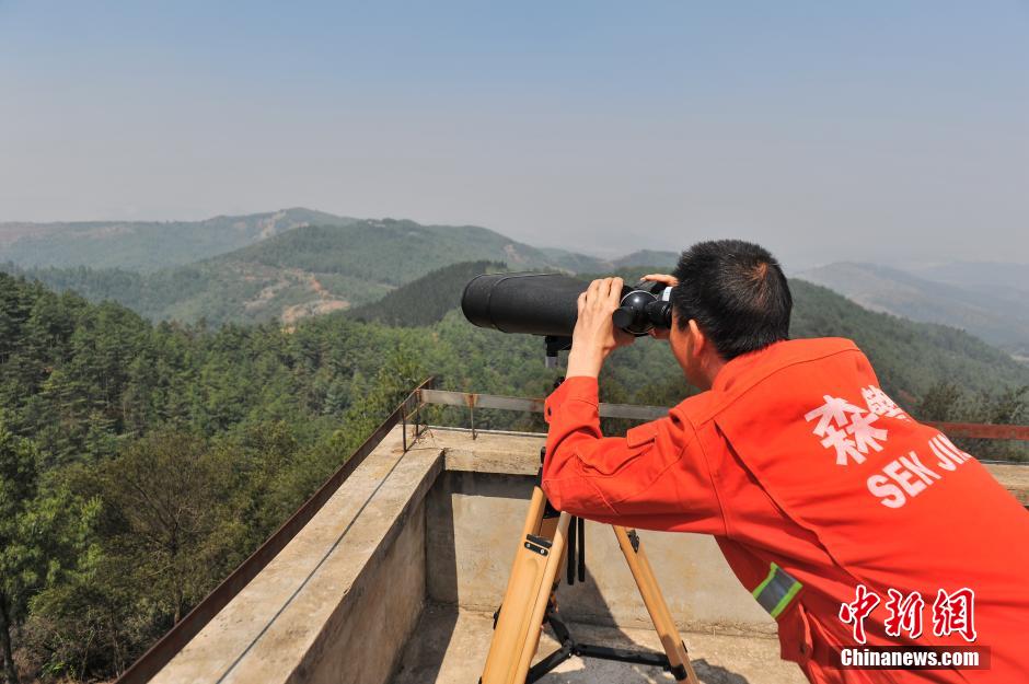 4月24日,昆明海口林场护林防火员在瞭望台上检查有无火情。