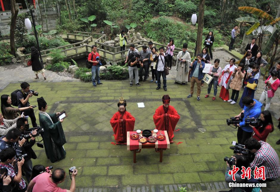 4月24日,重庆南山书院里,一对年轻人正在演示传统汉服婚礼。陈超 摄