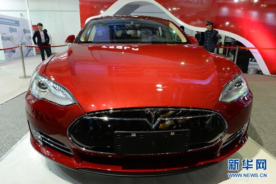 这是4月24日在“上交会”上拍摄的特斯拉电动汽车。当日,由美国电动汽车生产商特斯拉汽车公司生产的特斯拉电动汽车亮相第二届中国(上海)国际技术进出口交易会(上交会),吸引了诸多观众。新华社发(赖鑫琳 摄)