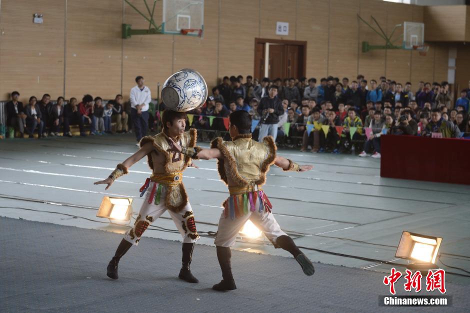 4月25日,杂技演员在表演头部传物。当日,内蒙古文联志愿服务团联合内蒙古杂技团举办下基层演出。中新社发 刘文华 摄