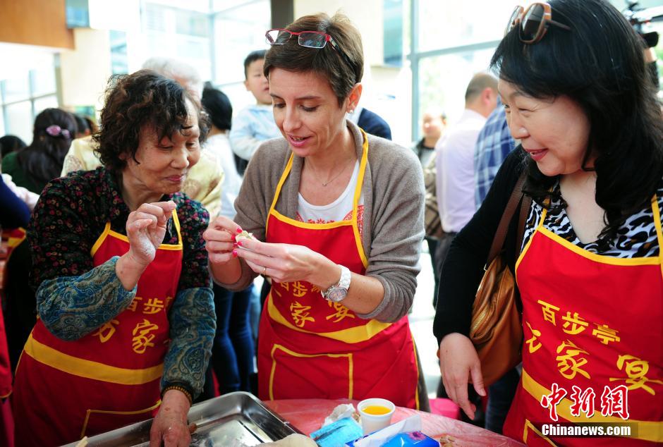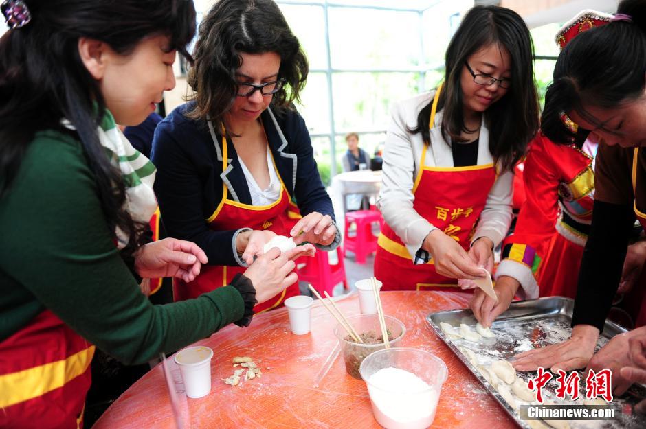 4月28日,20名在武汉生活的外国专家太太走进武汉百步亭社区,在社区居民指导下包饺子。此次活动为进一步推进外籍人士“家在武汉”工程,丰富在汉外国专家及家属业余生活,使她们了解武汉、融入武汉。截至目前,常年生活在武汉的外籍人士已达1.5万人左右,外籍人士在工商登记的企业有4000余家。中新社发 张畅 摄