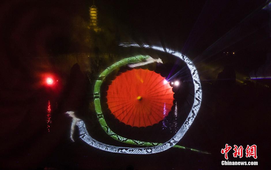 4月29日晚,大型水景秀《白蛇传》在江苏镇江金山湖畔上演。演出从许仙和白蛇的前世情缘说起,一直讲到当下人与自然的和谐共生。这是镇江“三山”景区在流传千年的白蛇传说的基础上,结合金山湖景区自然风貌,通过全彩激光与3D水幕投影的完美结合而打造的3D水景秀。夏雪 摄