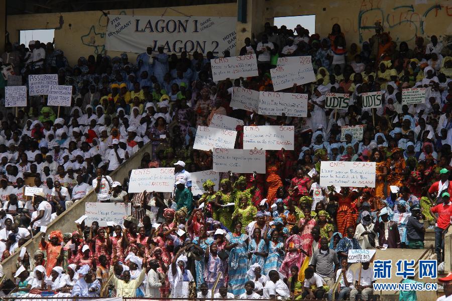 5月1日,在塞内加尔首都达喀尔,参加集会的群众举着保障劳动者待遇的牌子。当日,塞内加尔首都达喀尔的邓巴·迪奥普体育场内人潮涌动,来自塞内加尔各地的工会成员及劳动者举行大型集会,庆祝“五一”国际劳动节。集会活动以“稳定、振兴、进步”为主题,号召加强社会对话,推动社会进步。 新华社记者邰剑秋摄