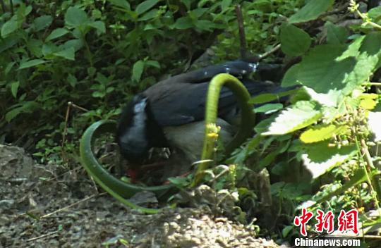 5月1日,湖南省辰溪县伍家湾乡斋家塘村一水田旁,出现一场鸟蛇相斗的有趣场面,一只红嘴长尾鸟斗败了一条一米多长的竹叶青蛇,并吃掉了蛇的头。    刘本杰 摄