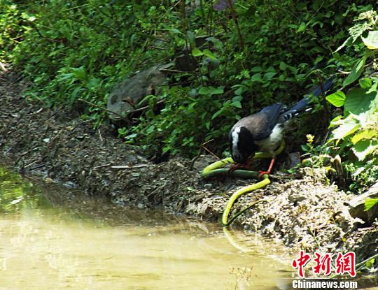 5月1日,湖南省辰溪县伍家湾乡斋家塘村一水田旁,出现一场鸟蛇相斗的有趣场面,一只红嘴长尾鸟斗败了一条一米多长的竹叶青蛇,并吃掉了蛇的头。 刘本杰 摄
