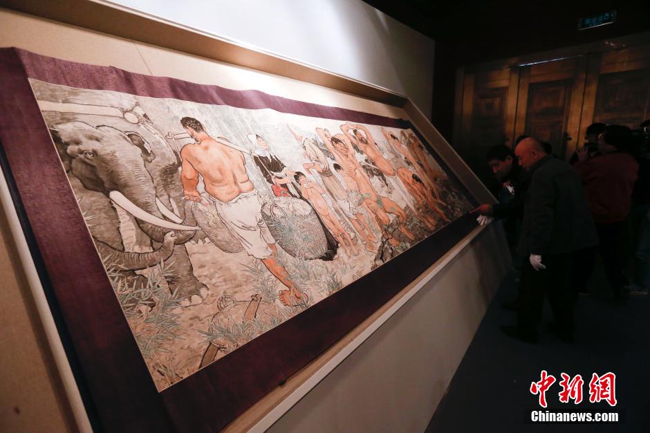 5月5日,“大师与大师——徐悲鸿与法国学院大家作品联展”在中华世纪坛世界艺术馆举行开箱仪式。展出徐悲鸿及法国学院大家们的绘画作品共123件,包括徐悲鸿四位法国老师的代表作品。此次开箱仪式选取了代表中国人物画最高水平的《愚公移山》,这是徐悲鸿在印度期间历时三个月绘制完成的巨作。中新社发 杜洋 摄