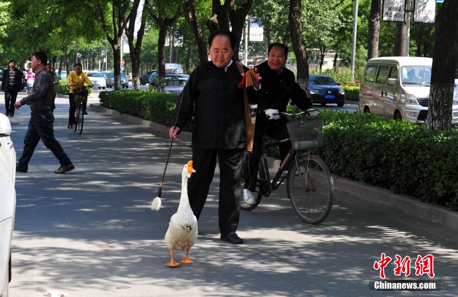 石家庄六旬老人每天遛“宠物鹅”散步