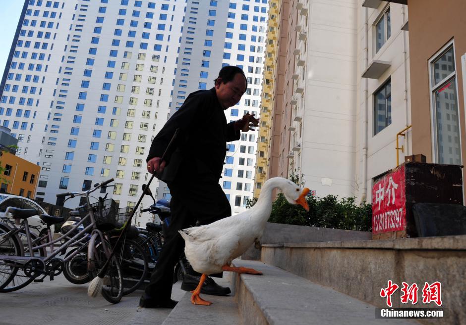 石家庄六旬老人每天遛“宠物鹅”散步