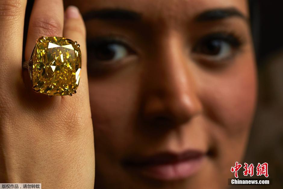 5月7日,在瑞士日内瓦,一名苏富比拍卖行的工作人员在预展上展示即将拍卖的100.09克拉的巨型钻石。