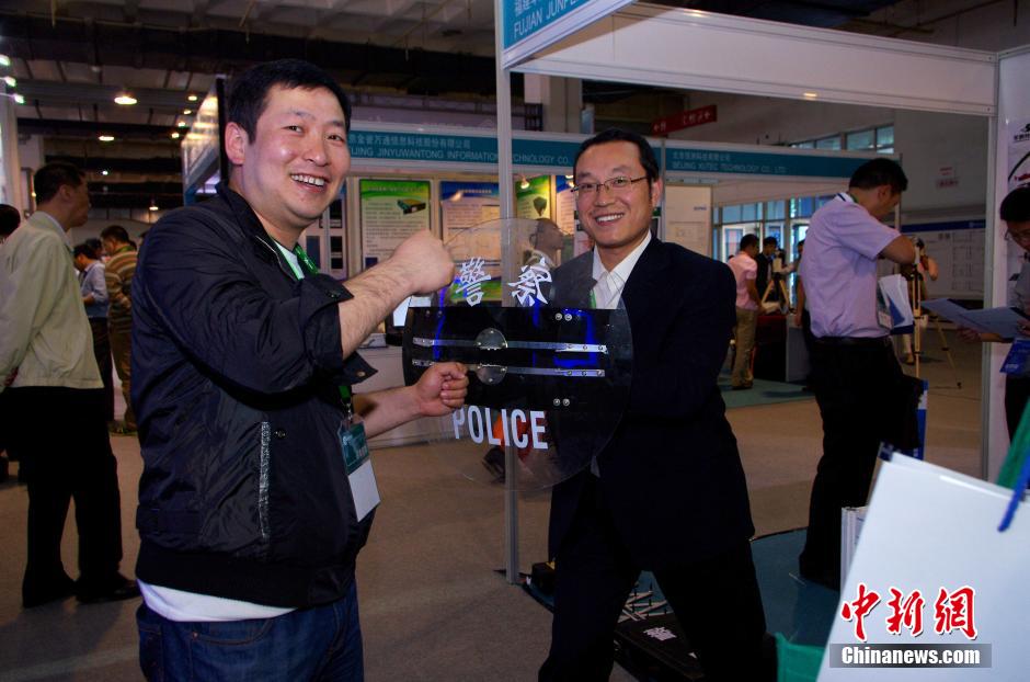 5月8日,观众正在体验警用防暴盾牌。当日,第九届中国国际国防电子展览会在北京开幕,近400家参展企业展出了国防、电子、兵器、航空等行业的最新产品。中新社发 贾天勇 摄