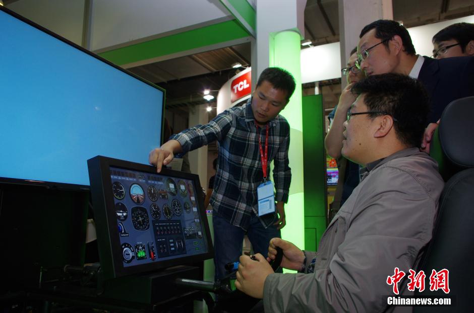 5月8日,第九届中国国际国防电子展览会在北京开幕。本届展会由中国电子科技集团公司和中国电子信息产业集团有限公司两大集团共同主办,汇集了国内外400余家知名企业参展,创历史新高。主办方表示,展会旨在对加速中国军事电子装备现代建设、提高中国军工产品的水平起到积极作用,同时促进军民融合深度发展。图为观众正在体验飞行模拟训练系统。中新社发 贾天勇 摄