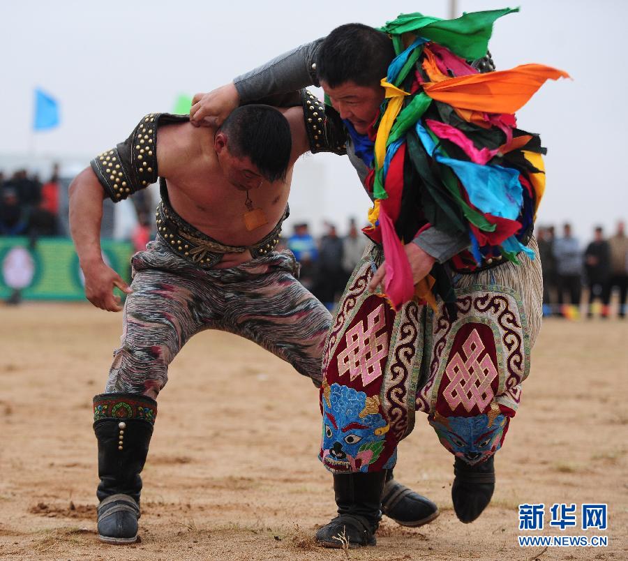 5月9日,搏克手在开幕式上表演。新华社记者 邵琨 摄