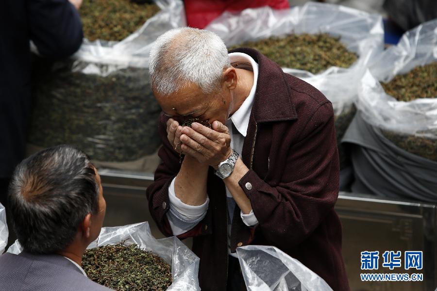 5月10日,在福建省安溪县中国茶都茶叶市场,前来采购铁观音春茶的客商在闻茶叶样品。新华社记者 沈伯韩 摄