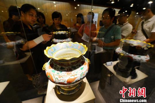 5月15日,为推动海峡两岸文物交流、传承中华古瓷千年文化,厦门首个海峡两岸文物展览专场《宋元古瓷萃》收藏展在厦门华侨博物院举行。图为台湾中华皇家艺术博物馆馆长汤沛霖(左)向前来欣赏的市民介绍元代红绿彩铜鎏金掐丝珐琅狮子法器花卉纹大罐。张斌 摄