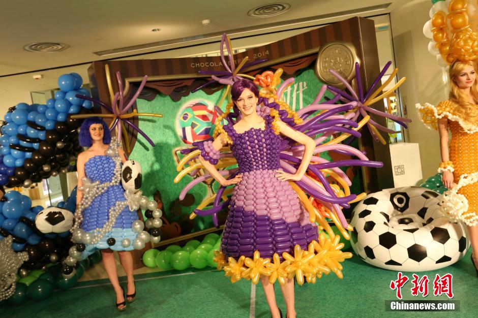 5月18日,重庆时代广场内模特穿着“气球服装”为市民展示。为了迎接即将到来的世界杯,重庆时代广场携手吉尼斯世界纪录保持者陈奕伟打造大型世界杯创意气球装置,邀请市民一起感受世界杯带来的快乐。活动现场除了展示由气球制成的大力神杯和足球及球鞋,模特儿还身着全部由气球制成的“气球服装”,向现场市民展示新颖独特的气球艺术造型。唐枫 摄