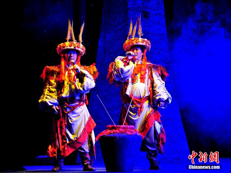 四川松潘20日晚间上演大型民族歌舞晚会《天地松州》,《天地松州》是一出集合了众多元素的情景剧目,杂糅了松潘的传说故事、民俗风情等几乎最具代表性的文化元素和情景表现,整台晚会演出歌、舞、诗、乐并重,以地域环境的人文为经,以民族风情为纬,以丰富多彩的民俗风情和民族歌舞元素突出松潘多民族的多元文化特点,集中展现了藏、羌、回、汉各民族浓郁的情感生活画卷。图为演出现场。松宣 摄