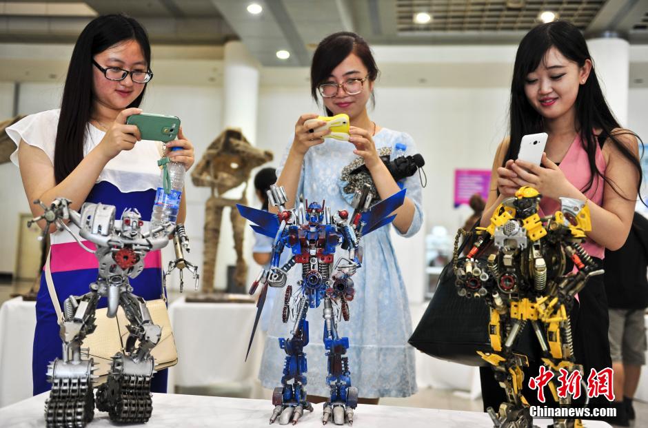 大学生的毕业设计“变形金刚”吸引女孩拍照。