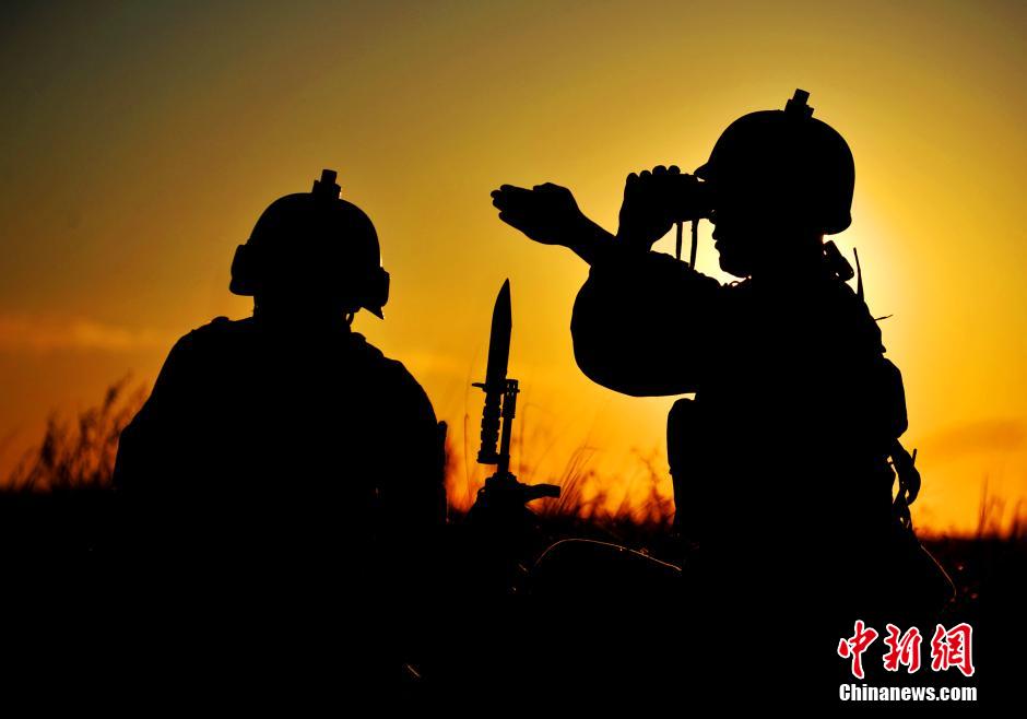 7月4日,“跨越2014----朱日和D”实兵演习进入红蓝实兵对抗战斗阶段,经过8个多小时的激战,代表红军出战的沈阳军区16集团军某旅以微弱优势打败蓝军,成为在此次系列演习中首支战胜蓝军的红方部队。图为晨曦中前沿侦察。中新社发 杨再新 摄