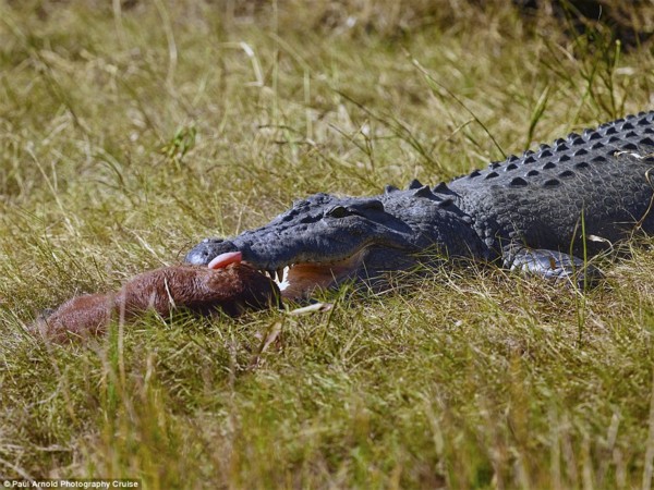 这么长的鳄鱼在这一地区约有4到5条。第二天,阿诺德又看到这条鳄鱼,它正在浅滩中打滚,好像吃得太多了。