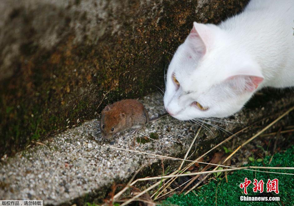 当地时间2014年7月16日, 斯洛文尼亚,一只猫和老鼠在院子里玩。
