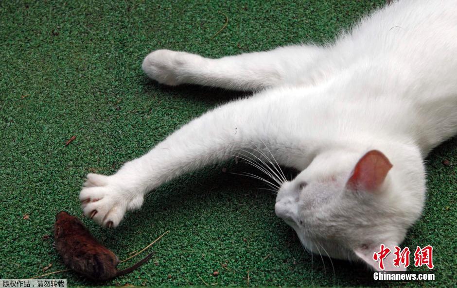 当地时间2014年7月16日, 斯洛文尼亚,一只猫和老鼠在院子里玩。