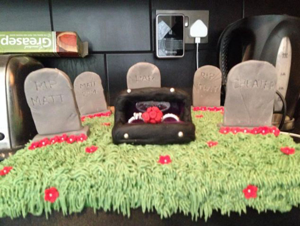这个蛋糕上有5块“墓碑”,上面分别写着“愿马特安息”、“愿蠢人安息”、“骗子”、“说谎者”、“憎恶者”等字眼。墓碑之间还有一副棺材,里面放着赫尔利的结婚与订婚戒指。