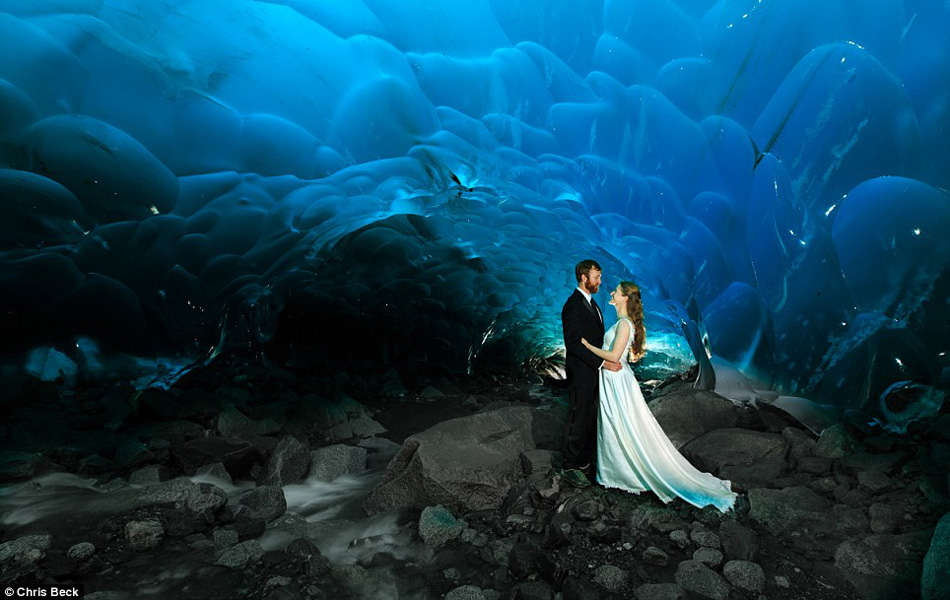 据《每日邮报》7月16日报道,美国一对新人选择在冰洞内拍婚纱照。2008年在阿拉斯加邂逅的Torsten和Sarah Ernst决定在一个不同寻常的地方留影,他们邀请了摄影师Chris Beck前往门登霍尔冰川(Mendenhall Glacier)拍摄婚纱照。