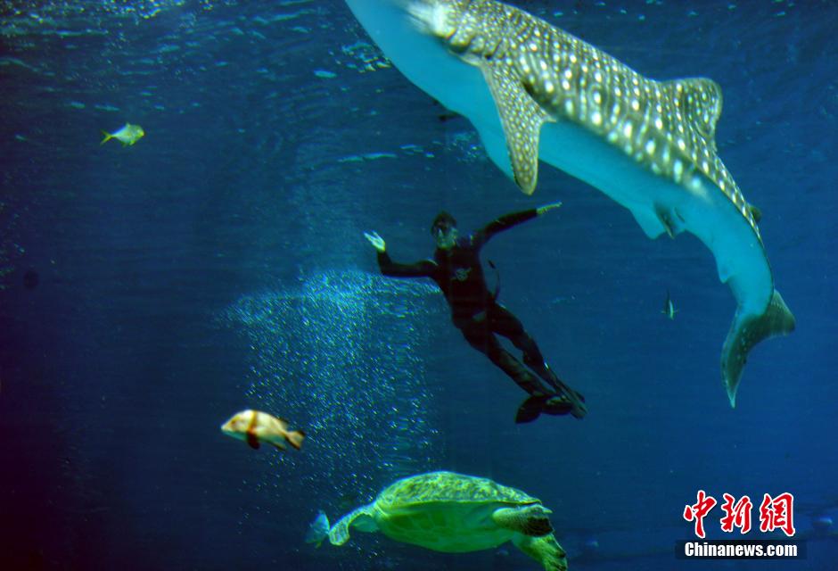 7月15日,长隆幸福大使田亮、森碟和叶一茜到珠海长隆海洋王国,在世界最大的海洋鱼类展馆“鲸鲨馆”里,田亮与新入驻的两条鲸鲨共舞海底芭蕾,抚摸鲸鲨,给鲸鲨喂食,并与鲸鲨合作,做出各种高难度与美感兼具的动作。中新社发 刘卫勇 摄
