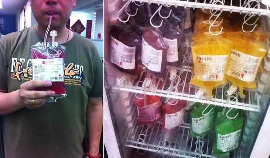 因为《暮光之城》、《吸血鬼日记》 等吸血鬼题材的影视剧近几年在国内掀起了一股“吸血鬼热”,所以辽宁、苏州等地的店家们也纷纷打起了“吸血鬼”的算盘——一种血袋饮料在苏州风靡,血袋包装类似医用血浆,还分出了A、B、AB、O、Other型五种供选择。
