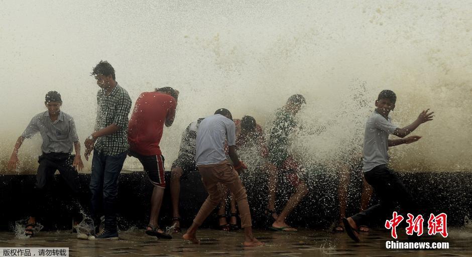 当地时间2014年7月14日,印度孟买,民众在海边享受涨潮带来的浪花冲击。