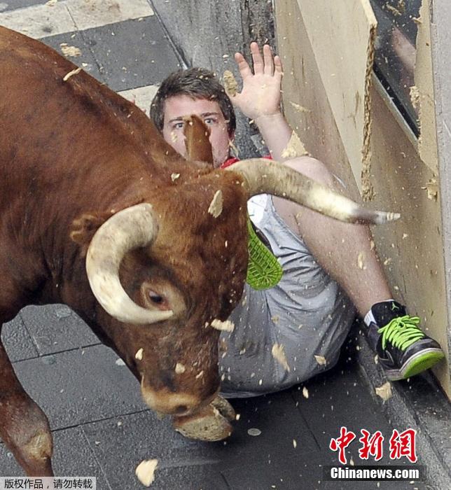 当地时间2014年7月14日,西班牙潘普洛纳奔牛节持续。据外媒报道称,截至14日共有两名参赛选手在奔跑中被牛角顶伤。