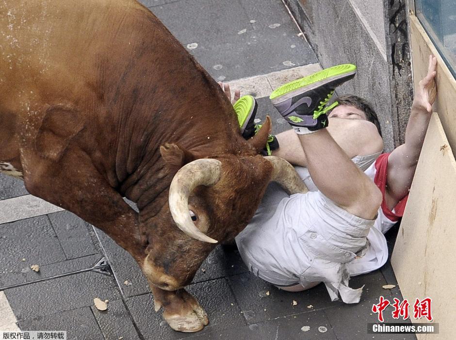 当地时间2014年7月14日,西班牙潘普洛纳奔牛节持续。据外媒报道称,截至14日共有两名参赛选手在奔跑中被牛角顶伤。