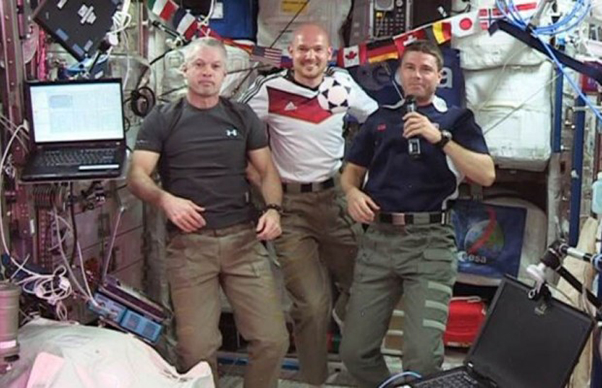 大致在决赛中场休息时,宇航员海特威丝曼将他和同伴们在空间站内观看世界杯决赛的照片传到推特上,并配博文称,“直到现在,这场比赛十分精彩!”。从威丝曼的言词中,不难看到,宇航员们在观战自己国家队决赛战的激动心情! 而在照片上,我们可以看到,宇航员穿上德国国家队队服,为德国队打气,同时,国际空间站装饰了征战世界杯的多国国家旗帜。
