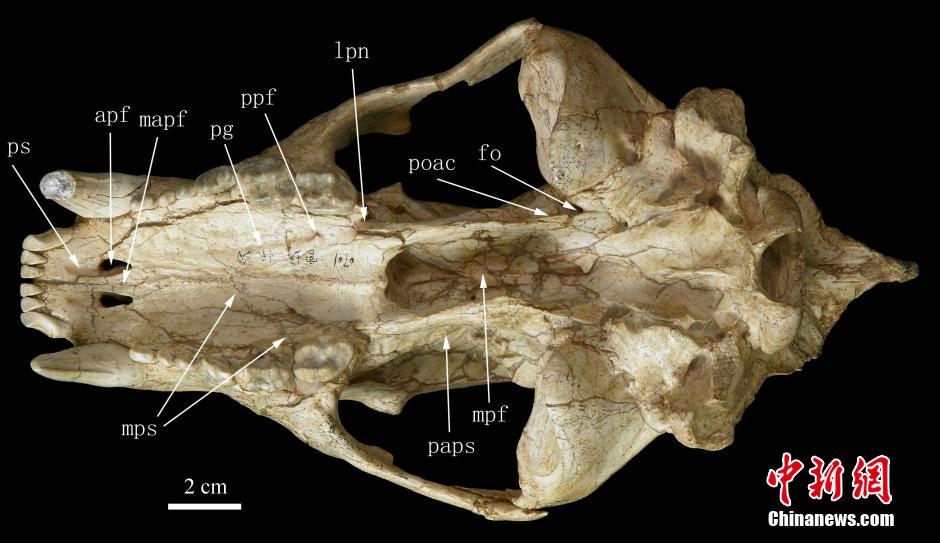 8月4日,中国科学院古脊椎动物与古人类研究所发布消息说,该所前所长、古哺乳动物学及地层学家邱占祥院士领衔科研团队,优先选择在临夏盆地发现的祖熊头骨及其下颌骨化石进行深入研究,将其确定为一个新种并命名戴氏祖熊,同时揭示戴氏祖熊为现生熊类祖先中最晚和最进步的一个种。最新出版的2014年第3期《古脊椎动物学报》以封面文章刊发了邱占祥团队这一研究成果。图为戴氏祖熊头骨腹面。中新社发 邓涛 摄