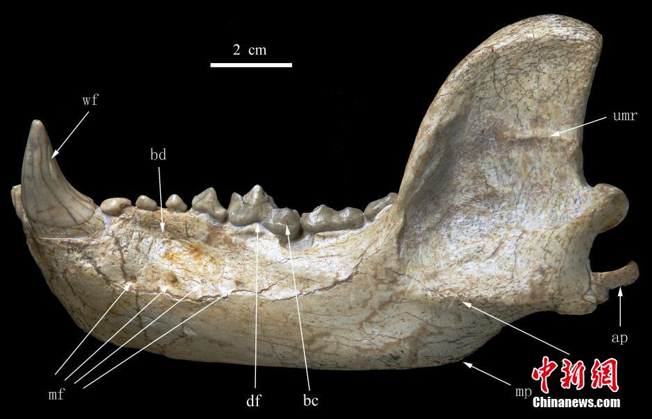 8月4日,中国科学院古脊椎动物与古人类研究所发布消息说,该所前所长、古哺乳动物学及地层学家邱占祥院士领衔科研团队,优先选择在临夏盆地发现的祖熊头骨及其下颌骨化石进行深入研究,将其确定为一个新种并命名戴氏祖熊,同时揭示戴氏祖熊为现生熊类祖先中最晚和最进步的一个种。最新出版的2014年第3期《古脊椎动物学报》以封面文章刊发了邱占祥团队这一研究成果。图为戴氏祖熊头骨腹面。中新社发 邓涛 摄